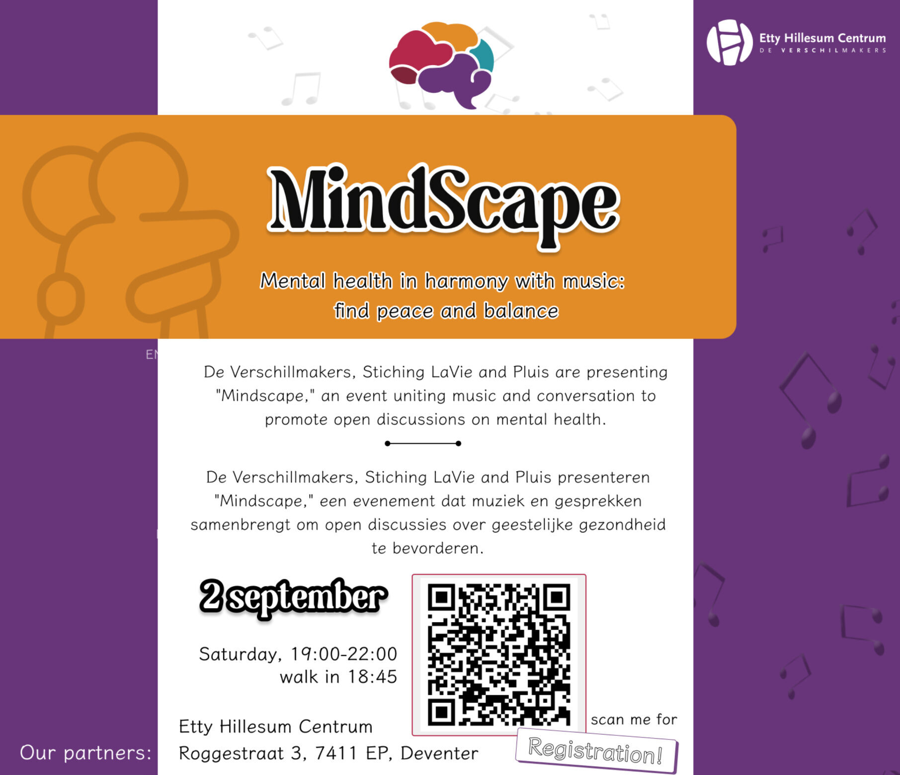 De Verschilmakers, Stichting LaVie en stichting Pluis presenteren met trots “Mindscape,” een evenement dat muziek en gesprek combineert om open discussies over mentale gezondheid te bevorderen. Sluit je aan bij ons op vier verschillende locaties en tijden voor deze bijzondere bijeenkomst. Ervaar meeslepende optredens van artiesten Sarina Noa, Ola & Hugo, Artik en Onesapa. Neem […] Lees verder »